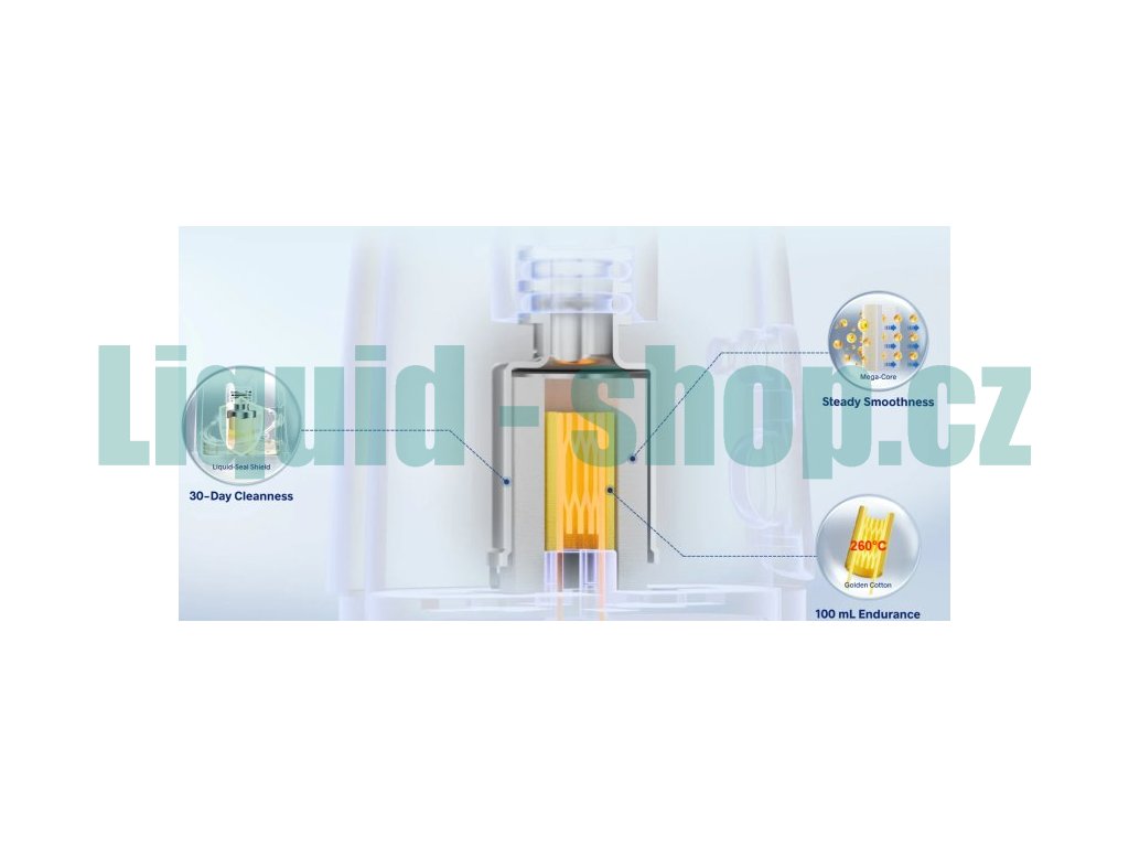 ARGUS Top Fill V2, která využívá nejnovější technologii iCOSM 2.0. Tato inovace přináší tři klíčové výhody: 30denní čistotu, stabilní a hladký projev a výdrž až 100 ml e-liquidu. Naše vlastní měděná komora vytváří e-liquidový film, který pokrývá 99 % vaty a udržuje stálý tlak vzduchu. Tento film je 3× hustší než u běžných konstrukcí, což zvyšuje odolnost proti protékání o 83 % a zajišťuje bezproblémový provoz i v náročných podmínkách. Bez protékání. Bez nepořádku. Čisté potěšení. Kompatibilní s celou řadou zařízení ARGUS.