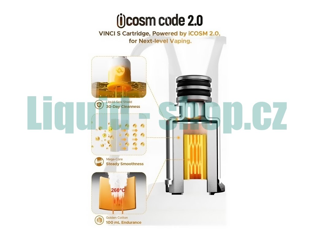 iCOSM Code 2.0Technologie iCOSM Code 2.0 stojí na třech pilířích: systém Mega-Core zajišťuje rovnoměrné nasycení a plynulý průtok e-liquidu bez chuťových výkyvů, letecká bavlna Golden Cotton odolává teplotám až 260 °C a vydrží po celou životnost cartridge, a systém Liquid-Seal Shield udržuje bavlnu trvale obalenou v e-liquidu, čímž spolehlivě zabraňuje úniku a zároveň zajišťuje její rovnoměrné nasycení po celou dobu životnosti cartridge. |