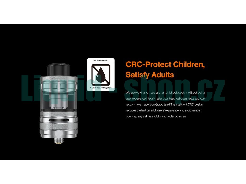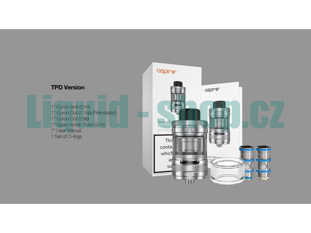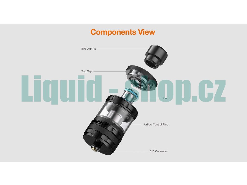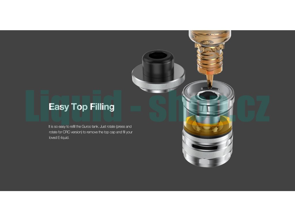 Výkonný DL Clearomizér s inovativní rychlou výměnou žhavící hlavy (Attach-Pull-Release) a objemu 4ml (možnost rozšířit až na 5ml) s horním plněním. Závit 510, regulace přívodu vzduchu (Airflow), dětská pojistka. 2x žhavící hlava Aspire Guroo v SETU.