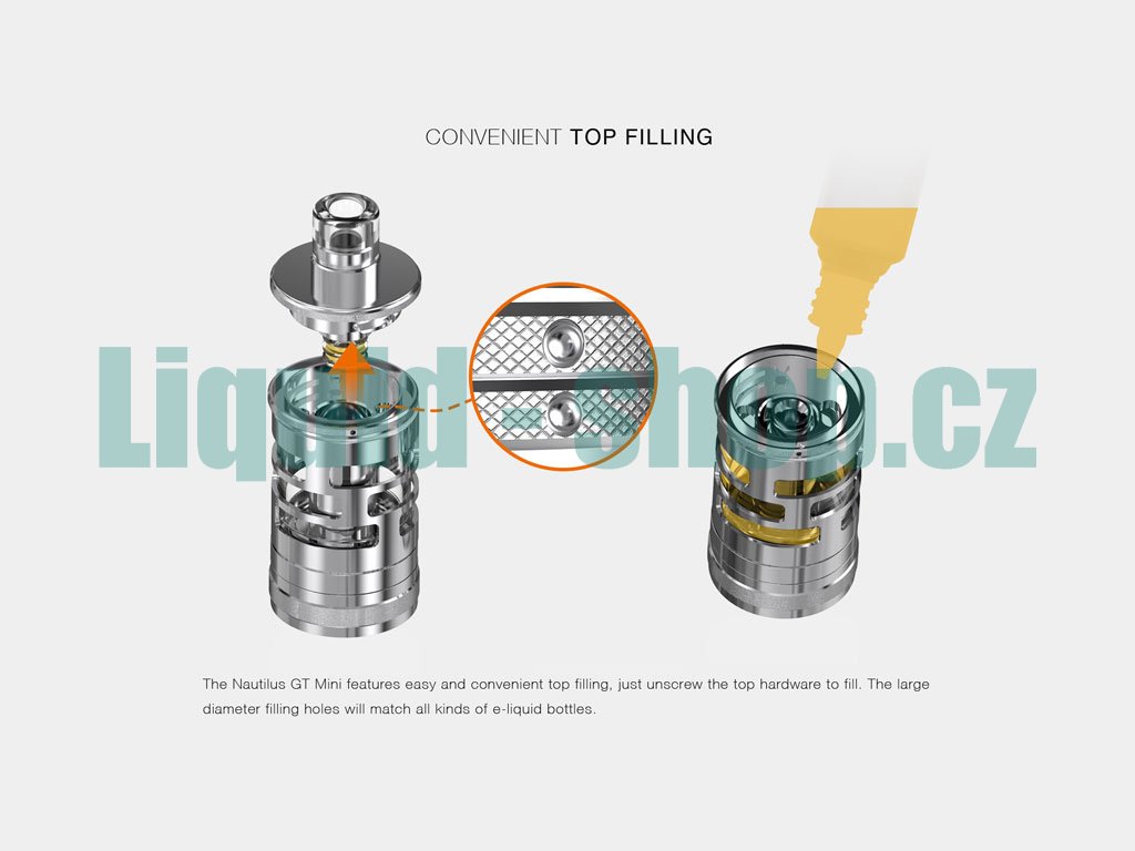 aSpire Nautilus GT Mini osloví především příznivce klasického MTL šlukování. Je postaven na kvalitní základně z ušlechtilé oceli, která je doplněna o kvalitní pyrexové sklo. Celkový objem pro náplň tak činí až 2,8 ml zásobního prostoru. Nastavitelný přívod vzduchu (Airlow) je samozřejmostí, a to v dokonalém provedení, které je přesně odstupňované celkem pěti různě velikými průchody. Průchod vzduchu může být také celkově uzavřen. Díky tomu to provedení je Nautilus GT Mini primárně určen pro klasický styl potahování MTL, jaký známe u klasických cigaret, nicméně v kombinaci se správně zvolenou žhavící hlavou a při plném otevření přívodu vzduchu lze snadno použít i pro přímý styl potahování do plic (DL). Vše završuje tolik oblíbený systém horního plnění, kdy stačí pootočit horní částí Clearomizeru a jednoduchým způsobem jí vytáhnout. K dispozici jsou dva dostatečně velké plnící otvory, kterými se plnění stane rychlou a jednoduchou záležitostí. K případné výměně žhavící hlavy stačí odšroubovat spodní základnu a samotné výměně už nic nebrání.