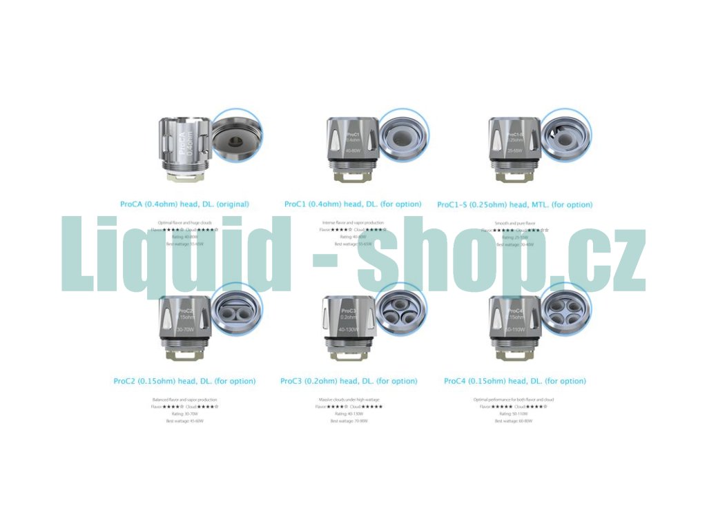 Clearomizér je kompatibilní se žhavícími tělísky ProC navrženými pro fungování s clearomizéry série ProCore. Do této série nově přibývají žhavící hlavy ProCA, které dodají plynulou produkci velice chutné páry. Dvě tato tělíska najdete hned v základním balení. Jejich odpor je 0,4 ohm a jádro se skládá z jedné kanthalové spirálky. O zjemnění chuti se postará náustek typu 810 ve vrchní části. Ve spodní části clearomizéru najdete závit typu 510 pro uchycení na většinu modů na trhu. Průměr clearomizéru činí jen 25 mm, je proto kompatibilní s drtivou většinou dnešních modů. Jedná se o vynikajícího pomocníka milovníkům přímého potahování, celá konstrukce clearomizéru je příjemně vzdušná a produkuje tak obrovské množství husté a chutné páry.