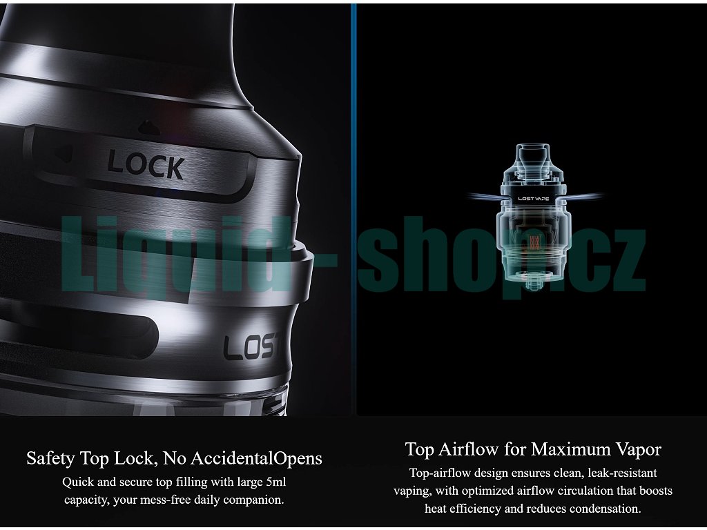 Regulace AirflowHorní airflow systém s dvěma protilehlými širokými otvory umožňuje plynulou a tichou cirkulaci vzduchu přímo k žhavící hlavě. Regulační kroužek poskytuje intuitivní ovládání intenzity potahu od částečně uzavřeného až po plně otevřený airflow, což vám umožní přizpůsobit vapování vašim aktuálním preferencím. Díky hornímu umístění je systém dokonale chráněn proti úniku e-liquidu do vzduchotechniky. |