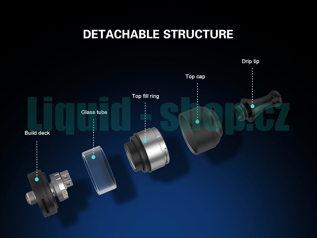 Plnění je také velmi praktické a jednoduché a probíhá pootočením (po směru hodinových ručiček) a sejmutím horní části Clearomizeru, pod kterou se nachází dva dostatečně velké otvory pro plnění, opatřené navíc membránou, která slouží nejen jako opatření proti nenechavým dětem, ale taky jako zpětná záklopka pro nechtěné protékání liquidu do meziprostoru tanku a sacímu drip tipu.