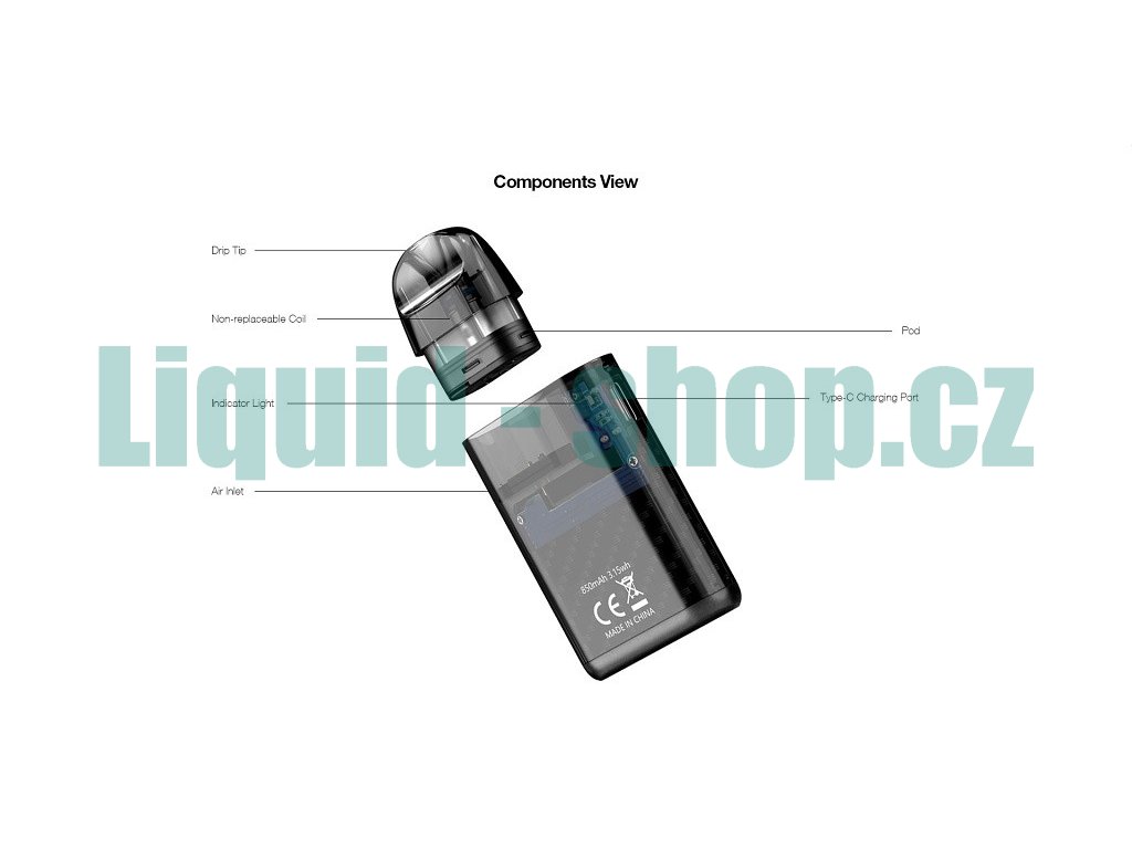 Malá a lehká Pod elektronická cigareta s integrovanou baterií o kapacitě 850mAh, automatická aktivace potahu, rychlé USB-C nabíjení, lehce vyměnitelná a plnitelná Pod cartridge o objemu 3ml s integrovanou žhavící hlavou s odporem 0,8ohm. Rozměry: 75mm x 40mm x 15,8mm.