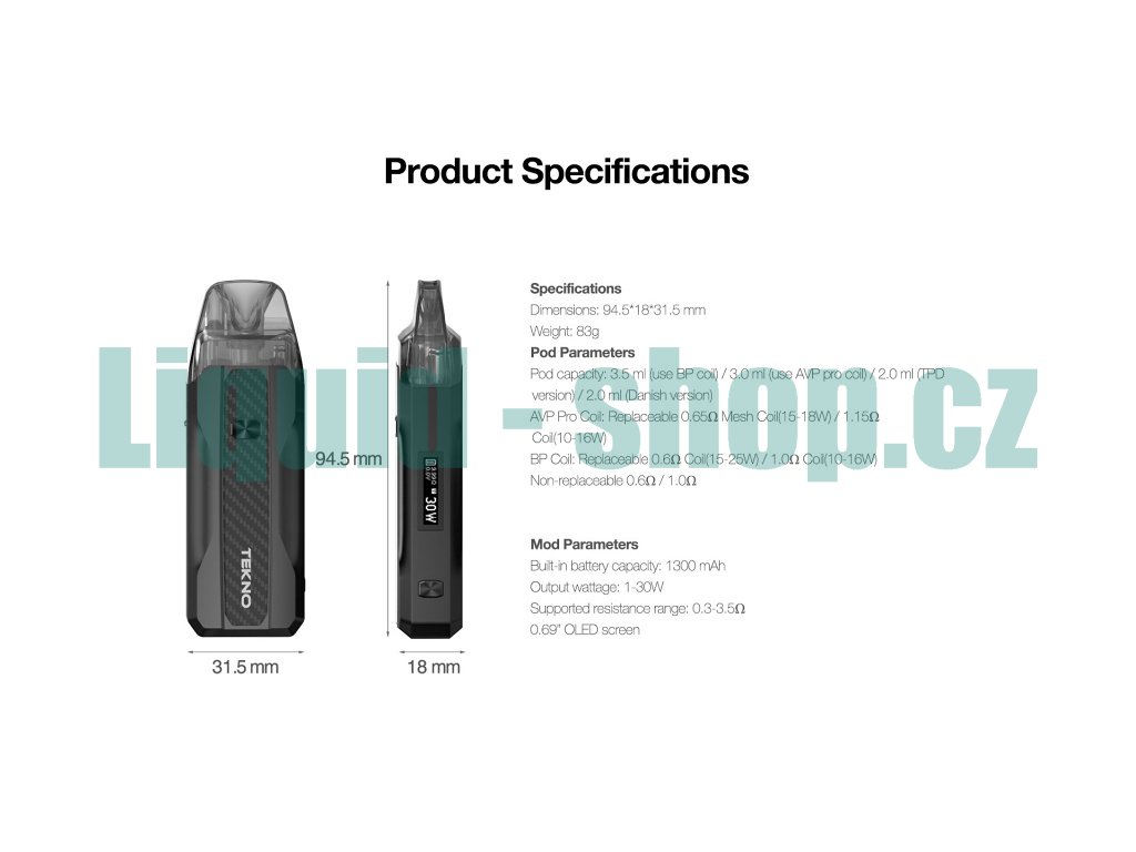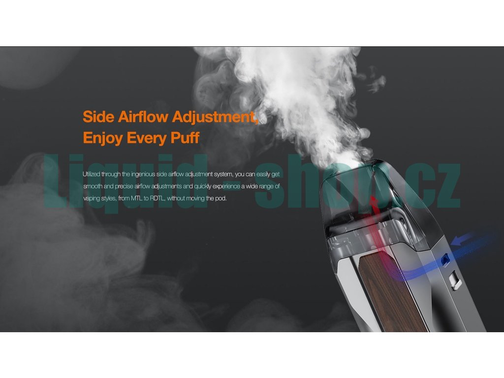 Výkonná Pod elektronická cigareta s kapacitou baterie 1300mAh, výkonem až 30W a displejem o velikosti 0,69 ”. Tělo vyrobeno ze zinkové slitiny. Vhodná pro MTL i RDTL styl vapování. Automatická i manuální aktivace baterie. USB-C nabíjení.