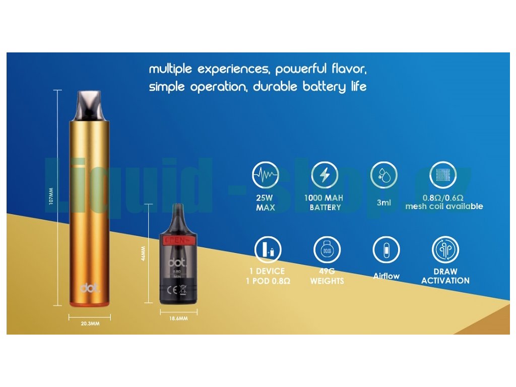 Moderní technologieDotmod Switch R Pod Kit představuje dokonalé spojení elegantního designu s pokročilými vaping technologiemi. Automatický provoz, velká kapacita baterie a prémiové zpracování činí z tohoto modelu ideální volbu pro všechny milovníky MTL vapování. Zařízení nabízí spolehlivý výkon a výjimečnou chuť v kompaktním balení. |