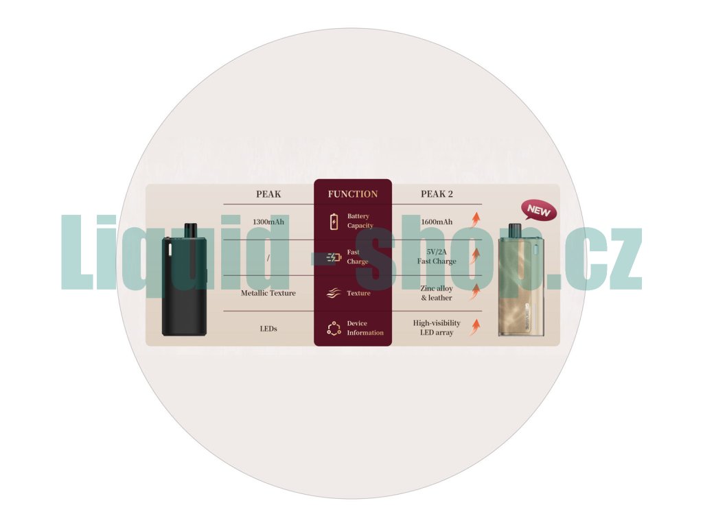 Nástupce populárního MTL modelu Peak od výrobce GeekVape se představuje s luxusně zpracovanou konstrukcí těla, která působí jako skutečné umělecké dílo. Inspirováno uměním designu ve spojení s dlouhou výdrží a jednoduchou obsluhou, to je GeekVape Peak 2. Tělo je nově poháněno integrovanou baterií o kapacitě 1600mAh a výkon je nastavován zcela automaticky ihned po připojení cartridge. Stav baterie si kdykoliv ověříte v reálném čase díky boční světelné indikaci a milovníky velké kapacity potěší přítomnost cartridgí Peak Pod s objemem 4 ml a pohodlným vrchním doplňováním. GeekVape Peak 2 cílí na jednoduchost a styl, který jinde nenajdete, jedná se o vymazlenou a plně automatickou e-cigaretu s co nejsnazší obsluhou a využitím na každodenní šlukování.