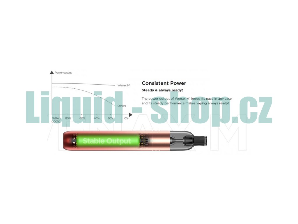 Elegantní elektronická cigareta s POD systémem GeekVape Wenax M1 přináší jednoduchý a pohodlný vaping. Tělo baterie z anodizovaného hliníku obsahuje integrovaný monočlánek o kapacitě 800mAh s USB-C portem. Adaptivní nastavení výkonu až 16W probíhá zcela automaticky podle použité cartridge. Aktivace e-cigarety Wenax M1 probíhá zcela automaticky bez potřeby jakýchkoliv tlačítek. Cartridge o objemu 2ml s odpory 0,8ohm a 1,2ohm.