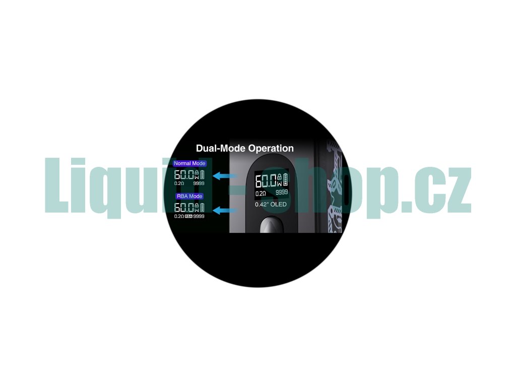 Pod bočním panelem modelu Centaurus B80 se nachází ovládací prvky v podobě černobílého OLED displeje, dvě regulační tlačítka a velké spínací tlačítko. E-cigareta pracuje se dvěma výstupními režimy, ve kterých si můžete pohodlně regulovat výkon. Ten lze regulovat v rozpětí 5 - 80 W. Na displeji budete mít také neustálý přehled o naměřeném odporu žhavící hlavy, nastaveném výkonu, stavu baterie, nebo počtu potahů.