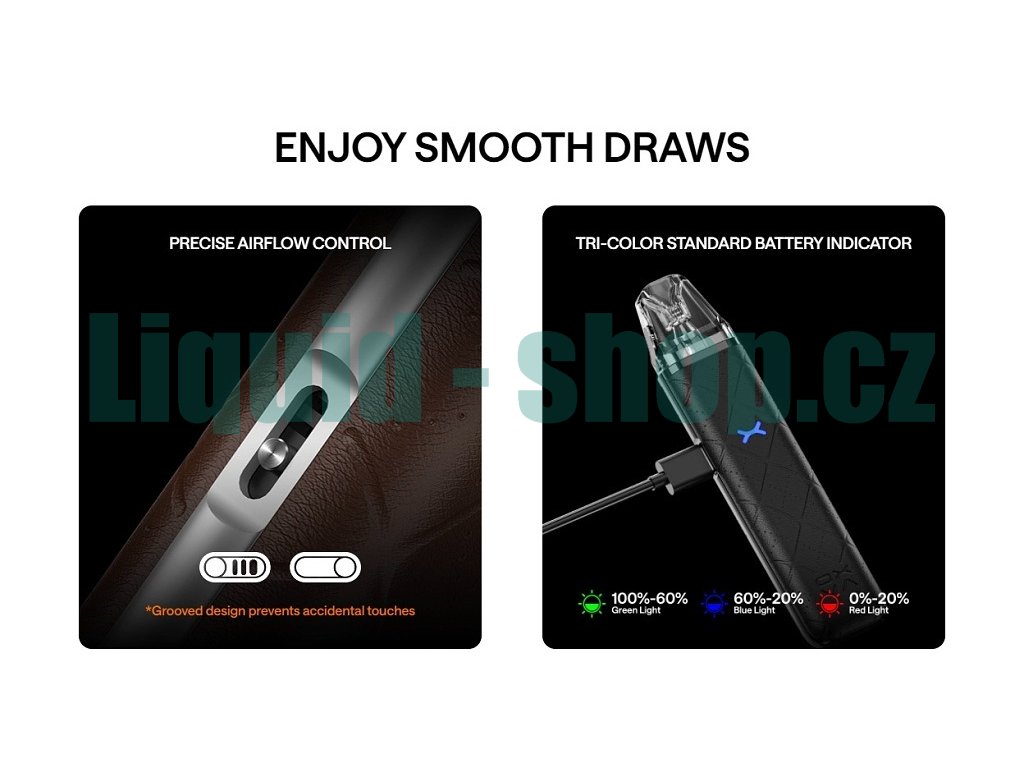 Parametry a specifikaceRozměry: 113.7 x 26 x 14.6 mm Kapacita baterie: Integrovaná 1000 mAh Režimy: Bypass Metody spínání potahu: Automatická aktivace potažením Výstupní výkon: 5-30 W (dle použité Pod Cartridge) Podporovaný odpor: dle kompatibilní Pod Cartridge Způsob nabíjení: USB-C port (5V/1A) Regulace výkonu: Automaticky Objem Pod Cartridge: 2 ml Styl potahování: MTL, RDL Odpor žhavících hlav v balení: 0,8Ω Regulace přívodu vzduchu (Airflow): Ano (stupňovaná) Hmotnost: 41 g Barva: Graffitti Black (Černá) Materiál: Umělá kůže + PCTG + plast |