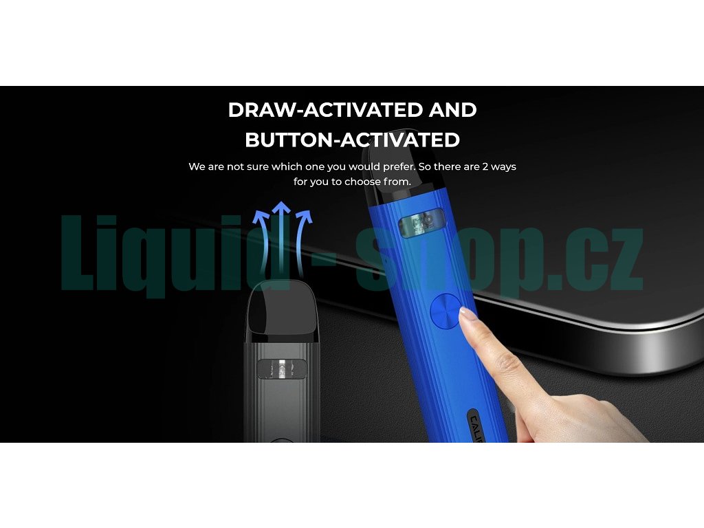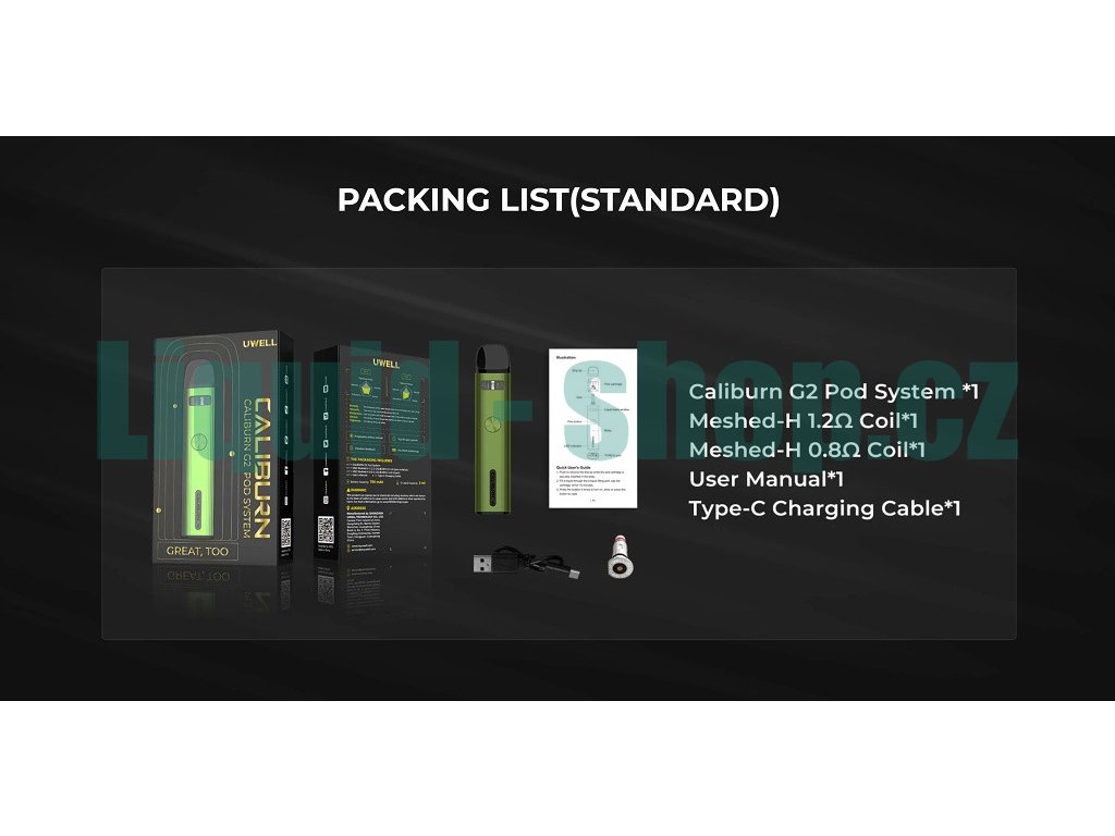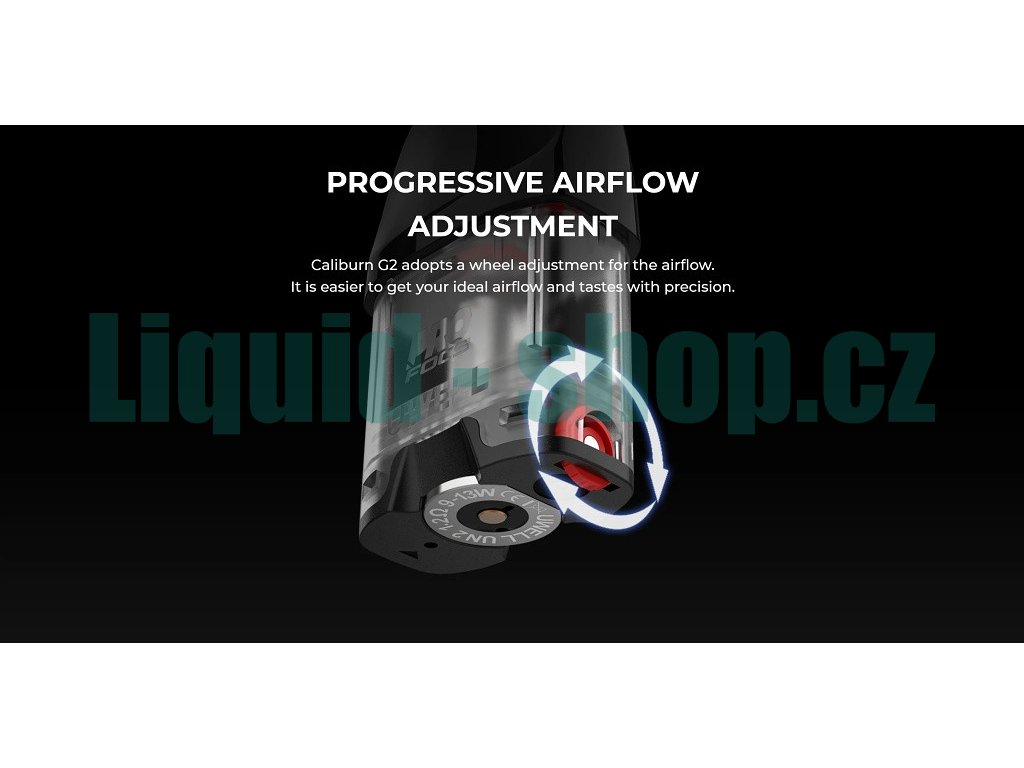 Velmi populární Pod elektronická cigareta Uwell Caliburn G se dočkala dalšího upgrade a přichází tak ve své druhé verzi, se kterou představuje nejen upravený design, ale také vylepšené parametry. V těle z hliníkové slitiny na Vás čeká integrovaná baterie s kapacitou 750mAh, která je vybavena barevnou LED pro přehlednou indikaci zbývající kapacity baterie. Pro rychlé nabíjení je na spodní straně e-cigarety připraven praktický USB-C port. Uwell Caliburn G2 nabízí jak automatický, tak i manuální systém žhavení. Vapování si tak užijete už po pouhém potahu z náustku, případně můžete i podržet tlačítko, se kterým přesně ovlivníte délku žhavení. Velkou změnou oproti předchozímu modelu je možnost nastavit si přívod vzduchu podle svých chutí a potřeb. Už není potřeba otáčet celou Pod Cartridge, samotný pod má nyní integrované kolečko, pomocí kterého nastavíte přesně takovou volnost potahu, jakou máte rádi. Rozměry 110,5mm x 22,5mm x 13mm, objem Pod Cartridge 2ml, konstanstní výkon 18W, materiál hliníková slitina, PA. Barevné provedení Carbon Black.
