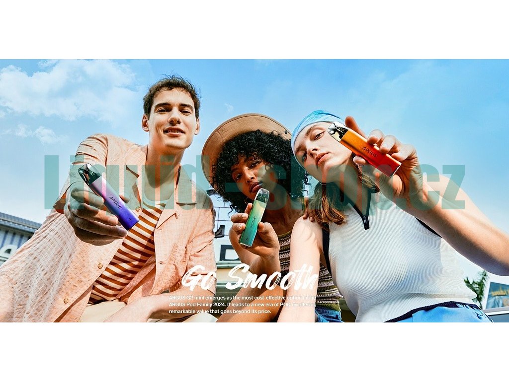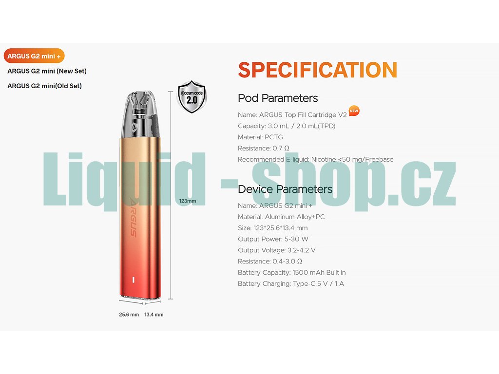 Výrobce VooPoo přichází s inovovanou verzí oblíbeného modelu G2 Mini, která nese označení G2 Mini+. Tato vylepšená verze přináší zvýšenou kapacitu baterie a ještě lepší výkon pro náročnější uživatele. VooPoo Argus G2 Mini+ je kompaktní a výkonná elektronická cigareta pro MTL/RDL styl vapování, ideální pro každodenní nošení, která nabízí vynikající poměr ceny a výkonu a je vybavena vylepšenou baterií o kapacitě 1500 mAh, poskytující o 25 % více energie než původní model po celý den i při náročnějším používání. Díky svému ergonomickému designu a lehké konstrukci z hliníkové slitiny padne pohodlně do ruky a její intuitivní ovládání zaručuje snadné používání i pro začátečníky, navíc disponuje nastavitelným přívodem vzduchu (Airflow) pro personalizaci vapovacího zážitku, automatickou regulací výkonu v rozmezí 5-30 W (dle použité Pod Cartridge) a inteligentními ochrannými funkcemi pro bezpečné používání, jako je ochrana proti přehřátí, zkratu a nadměrnému vybíjení baterie. Díky Pod Cartridgím s objemem 3 ml a odporem 0,7 ohm nabízí bohatou produkci páry a zároveň dostatečnou zásobu e-liquidu pro dlouhodobé vapování.