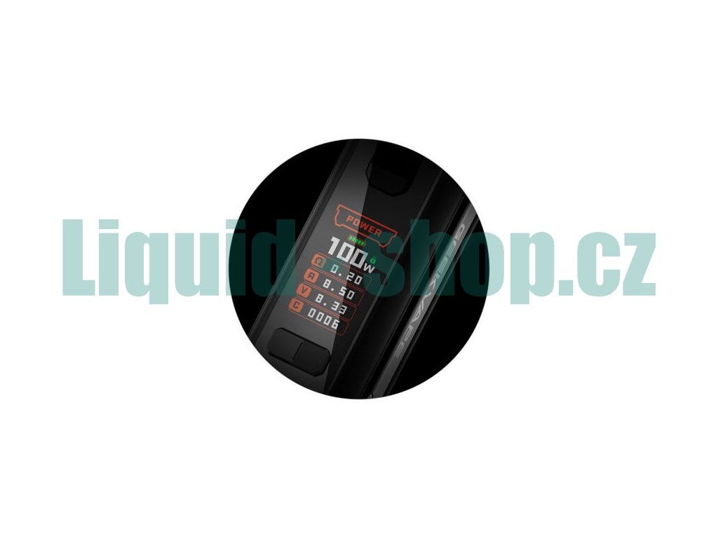 Přímo v přední části se potom nachází ovládací panel s velkým, celobarevným displejem. Na tomto displeji máte přehled o všech důležitých parametrech a zároveň si můžete nastavovat jeden ze tří výstupních režimů: Power, VPC a Bypass. Celé nastavení modu je nesmírně intuitivní a hravě si s ním poradí také začátečníci v oblasti elektronických gripů.