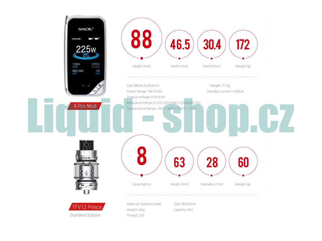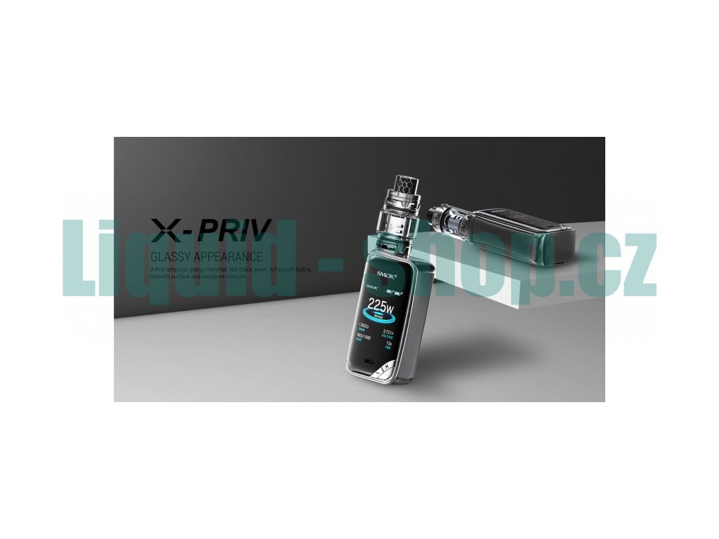 V jednoduchosti je síla. Tímto mottem se nechal inspirovat Smoktech, který vsadil na jednoduché tvary a dle prvního dojmu se jim to vyplatilo. Stále zde nalezneme našlapaný agregát o síle až 225W poháněný 2 bateriemi 18650. Milovníci teploty si také přijdou na své, jak už bývá u dnešních gripů zvykem. X-Priv si snadno spletete s telefonem, jelikož má 2 palcový display a zabírá tak celou stranu gripu. Díky tomu je velice přehledný a vy se tak velice rychle dozvíte všechny důležité informace o nastavení a indikaci baterií. Ty lze nabíjet skrz USB konektor, přičemž Smok dodává vysoce kvalitní USB kabel, který jen přidává na dojmu luxusu. Smok tento grip osadil clearomizerem Prince s konvexní Pyrex nádržkou o objemu 8ml. Tímto spojením si tedy můžete užívat opravdu dlouhého vapování bez rušivých elementů dobíjení a doplňování liquidu. Široký výběr žhavicích hlav obstarávají čtyrspirálkové Q4 a M4, šestispirálková X6, na míru šitá RBA a monstrozní desetispirálkový výrobce páry T10.