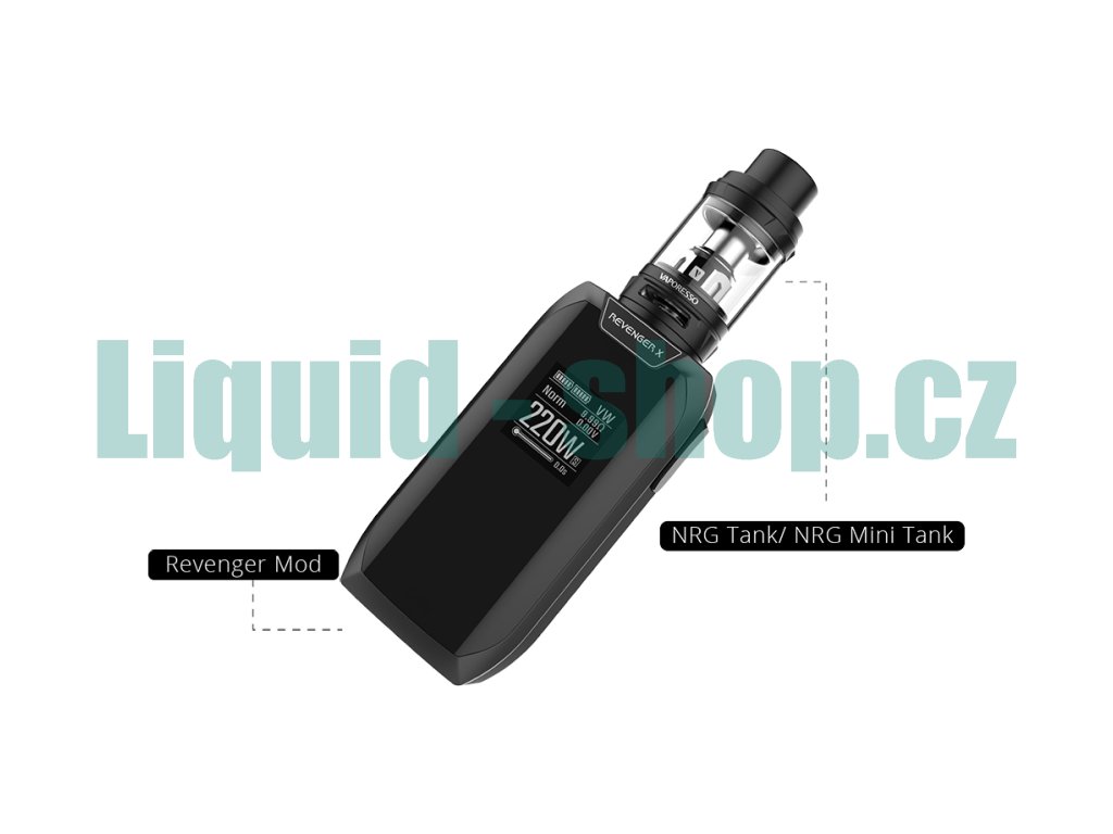 Druhá verze úspěšného gripu Revenger na sebe nenechala dlouho čekat. Revenger X přináší tři zásadní novinky. První dvě se doslova skrývají ve spínači a regulačních tlačítkách. Jedná se o jednoduché ovládání a spínání bez klasických tlačítek. Lehkými stisky na prostřední část gripu (viz foto) si vybíráte požadované funkce, a díky vibračnímu čipu poznáte, že nastavení proběhlo úspěšně. Dotykový senzor spínače je umístěn pod regulátory. Třetí novinka je nastavení jasu 16-ti stupni. Revenger X nabízí velký výběr režimů, od klasického VW (výkon) a TC (teplotní režimy) až po nastavení různých hodnot výkonu či teploty v prvních 5-ti vteřinách potahu. Velký 0,96 palcový displej Vám kromě zobrazení potřebných údajů pro vaping umožní nastavit reálný čas v podobě RTC režimu. Vyměnitelné monočlánky typu 18650 (2ks, min 25A) poslouží jako zdroj energie. V této sadě nalezneme clearomizer NRG Mini o kapacitě 2ml. Využívá systém horního plnění - po odsunutí vrchní části, plníte liquid otvorem přímo do těla clearomizeru. Celý clearomizer je plně rozebíratelný = snadná údržba. Jeho velkou předností jsou žhavicí hlavy GT, které přináší velkou kouřivost a autentickou chuť liquidu. Žhavicí spirálky jsou obaleny v organické bavlně a zapuštěny do keramického těla. Regulace přívodu vzduchu pro nastavení optimální kouřivosti se nachází ve spodní části.