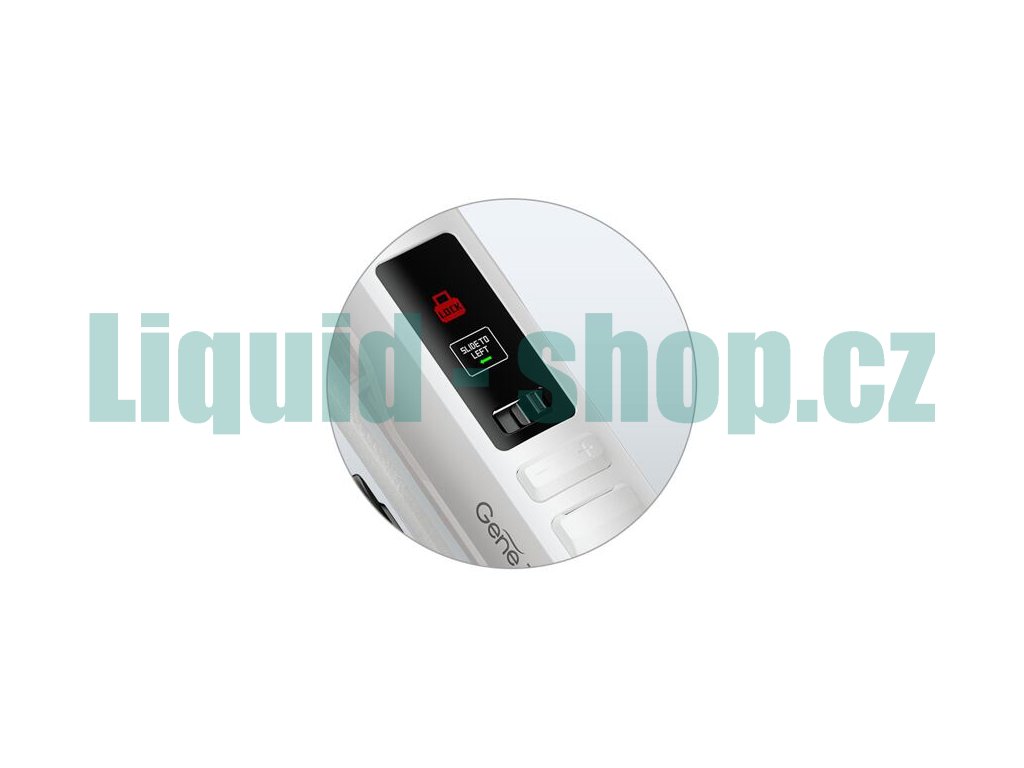 Přímo u displeje se nachází praktické zamykací tlačítko. Jeho posouváním tak můžete mod uzamykat, či odemykat. Manuální zámek využijete například při častém přenášení modu v kapse, nebo v cestovním zavazadle, zabraňuje nechtěnému a samovolnému sepnutí zařízení, slouží však také jako praktická dětská pojistka.