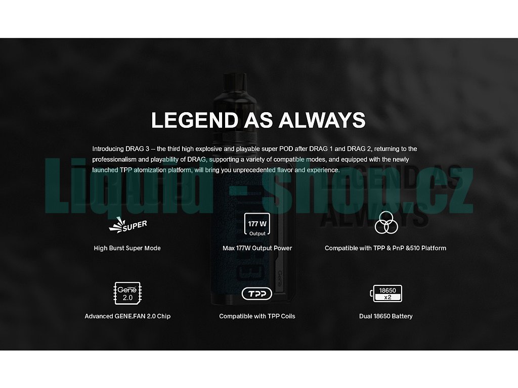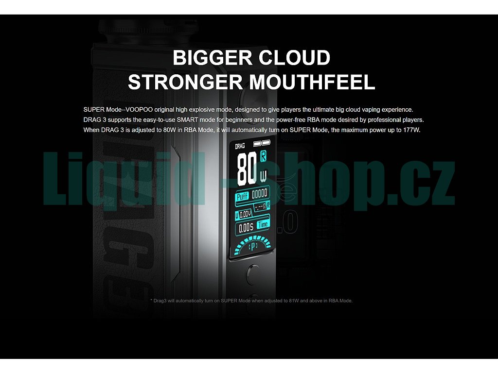 Samotný Grip VooPoo DRAG 3 pohání hned dvě baterie typu 18650 (Nejsou součástí balení). Pokročilý Gene.Fan 2.0 Chip dodává maximální výkon až 177W a celou řadu pokročilých funkcí. Nový chip přináší také bleskurychlé žhavení, a to za rovných 0,001s, kontinuální stabilní výkon a inteligentní režim SMART, který podle odporu použité žhavící hlavy nastaví správný výkon. Tuto funkci ocení především začínající uživatelé, ale i pokročilejší vapeři, kteří nechtějí ztrácet čas složitějším nastavováním. Zcela nový režim SUPER pak dodá okamžitý boost, což zajistí obrovskou produkci páry kdykoliv si budete přát. RBA režim je pak zkratkou pro klasický VW režim s možností nastavení výkonu v rozmezí neskutečných 5 - 177W. Pro opravdové profesionály je pak možné nainstalovat také režim TC (Temperature Control), který můžete získat aktualizací firmware, která je k dispozici na stránkách výrobce VooPoo. Tyto všechny funkce a nastavení zobrazuje velmi přehledný a velký 1,8" palcový TFT displej, který dominuje celému zařízení. K ovládání všech funkcí i samotnému žhavení slouží tři ovládací tlačítka, které jsou umístěny na čelním panelu nad i pod displejem.