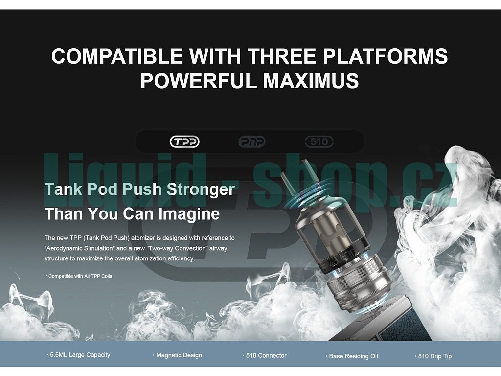 Vysoce výkonný Set prvotřídního Gripu od společnosti Voopoo, na baterie 18650, výkon až 177W, prvotřídní čip GENE.FAN 2.0, Režimy Smart, RBA, Super, TC. Balevný OLED displej, USB-C nabíjení, Špičkový Voopoo TPP Pod Tank Clearomizér s kapacitou 5,5ml. 2x žhavící hlava Voopoo TPP v Setu. Závit 510, materiál zinková slitina, kůže, PCTG.