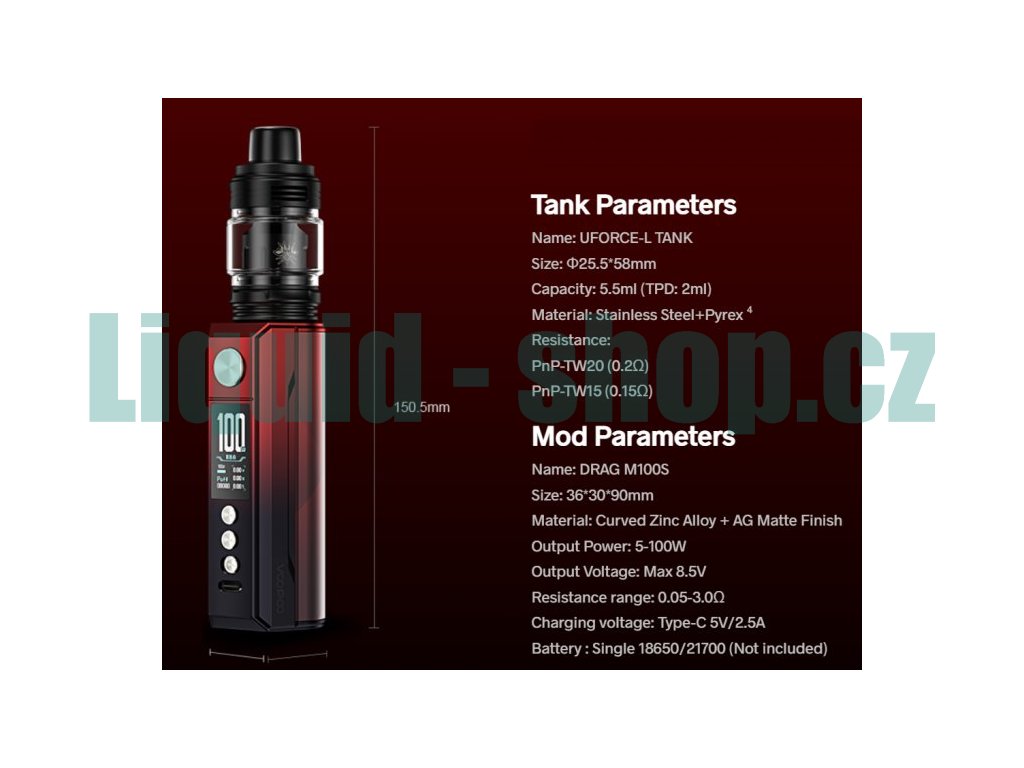 Není určeno pro náplně obsahující nikotin! VOOPOO DRAG M100S je nový jednobateriový grip, jehož základ vychází ze 4. generace série VOOPOO DRAG. Prvotřídní tělo baterie ze speciální zinkové slitiny s doplňky z masivního dřeva a matných antireflexních povrchů je zárukou prvotřídních zážitků z vapingu. Po vložení monočlánku typu 18650/21700 vás přivítá čip GENE.TT 2.0, který nabízí nastavitelný režim pro výkon až 100W, nastavení teploty spirál (TC) nebo ECO mod. Mezi jeho další přednosti patří ochrana proti zkratu, přehřátí a moderní USB-C port pro rychlé nabíjení. Výrobce k této sadě přidělil clearomizer UFORCE-L o objemu 5,5ml, který disponuje inovativním 3-otvorovým přívodem vzduchu. Jeho uživatelsky nejlepší vlastností je kompatibilita se žhavícími hlavami řady PnP.