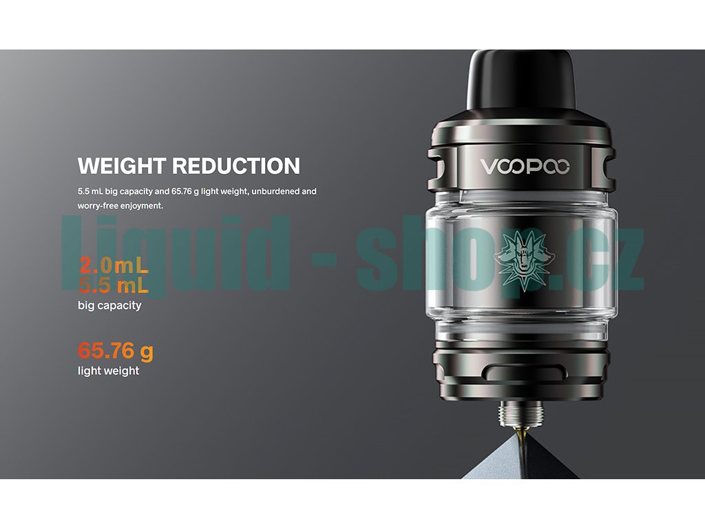 Parametry a specifikaceVýrobce: VooPoo Objem: 5,5 ml Odpor žhavících hlav v balení: 0,15Ω, 0,2Ω Materiál spirálek: Mesh NiCr, FeCr Styl potahování: DL (Direct Lung) Způsob plnění: Vrchní výsuvné Závit: 510 Regulace přívodu vzduchu: Horní airflow Rozměry: 52,95 mm × 28,4 mm (29 mm bubble) Materiál: Nerezová ocel + borosilikátové sklo Legislativa: Není určeno pro náplně obsahující nikotin Barva: Black (Černá)